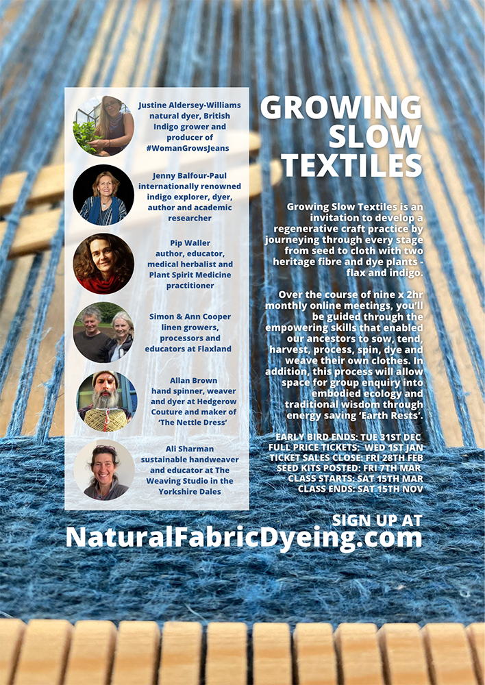 Growing Slow Textiles is an invitation to develop a regenerative craft practice by journeying through every stage from seed to cloth with two heritage fibre and dye plants - flax and indigo. During this holistic process you’ll join a pioneering community exploring deep ecology and defining for ourselves what it means to be ‘Earth Restorers’.